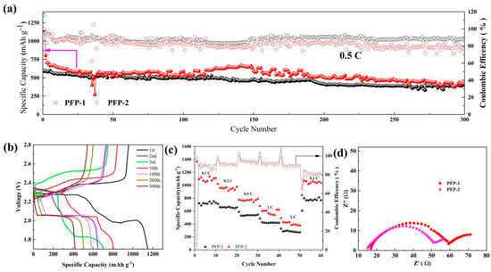 Electrochemical performance of PFP-1 and PFP-2: (a) cycling performance at 0.5 C current density; (b) charge and discharge profiles of 1st, 2nd, 3rd, 10th, 100th, 200th, and 300th cycles; (c) rate performance at different current densities; (d) impedance measurement.