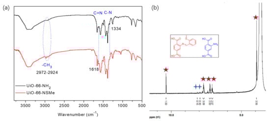 (a) FT-IR spectra of UiO-66-NH2 and UiO-66-NSMe. (b) 1H NMR spectra of UiO-66-NSMe digested in DMSO-d6/HF.
