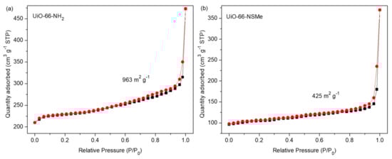 N2 sorption isotherms for compounds UiO-66-NH2 (a) and UiO-66-NSMe (b) at 77 K. The adsorption and desorption branches are shown with black square and red circle, respectively.