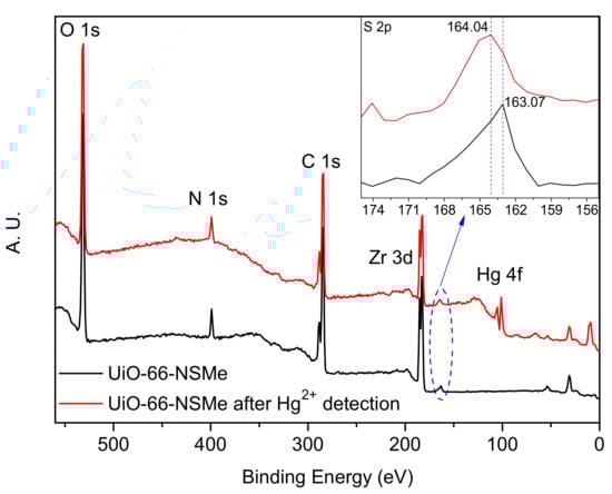Furthermore, the X-ray photoelectron spectroscopy (XPS) spectra of UiO-66-NSMe were measured both before and after Hg2+ detection. After Hg2+ detection, a new peak corresponding to Hg 4f at a binding energy of approximately 100.91 eV emerged in the full spectrum of UiO-66-NSMe. This unequivocally confirms the adsorption of Hg2+ within the channels of UiO-66-NSMe (Figure 5). Intriguingly, a shift from 163.07 eV to 164.04 eV in the binding energy of the S 2p peak was observed before and after Hg2+ detection. Such a shift implies an augmented electron density around the sulfur (S) atoms, likely stemming from the coordination interaction between Hg2+ and S atoms within UiO-66-NSMe. Thus, combined with the structure of UiO-66-NSMe, it is possible that Hg2+ ions are chelating coordinated by the S and N sites in UiO-66-NSMe.