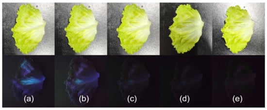Noticeable differences in fluorescence became evident when UiO-66-NSMe suspension (0.33 g/L) was introduced to the surface of the lettuce under ultraviolet light, and the change in fluorescence was observed within 30 s. Lettuce was subjected to spraying with solutions of varying concentrations: 0 (a), 0.04 (b), 0.18 (c), 0.35 (d), and 0.56 (e) mM Hg2+, simulating mercury (II) residue.