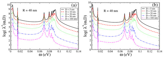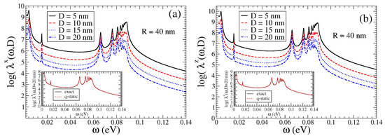 In Figure 2, in the main panels, we present the Purcell enhancement factors , , for a QEMI placed at nm from a BiSe TOPIN nanosphere, with nm and . An impressive increase in the decay rates over eight orders of magnitude is found, which apparently is not significantly affected by the distance D of the QEMI to the surface of the SNP. We note that distinct peaks arise above a frequency-independent—within the range shown—strong enhancement. We note that the Purcell factor increase dependence on the TOPIN nanosphere radius R for a QEMI placed at nm from the surface of the BiSe SNP is marginal (not shown here) for sphere radii in the range between 40 nm and 100 nm, as explicitly discussed in Ref. [36]. In the insets of the two panels of Figure 2, we compare the Purcell enhancement for a QEMI placed at nm from the surface of a BiSe SNP with nm obtained numerically with the electromagnetic Green’s tensor method [9,46] to the results obtained within the quasi-static approximation using Equations (7) and (8); obviously, the agreement between the two methods is very good, indicating in this case the validity of the quasi-static approximation.