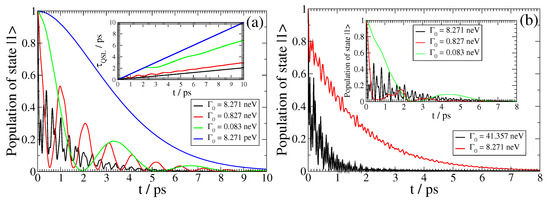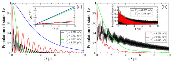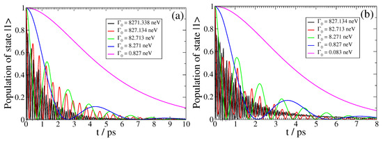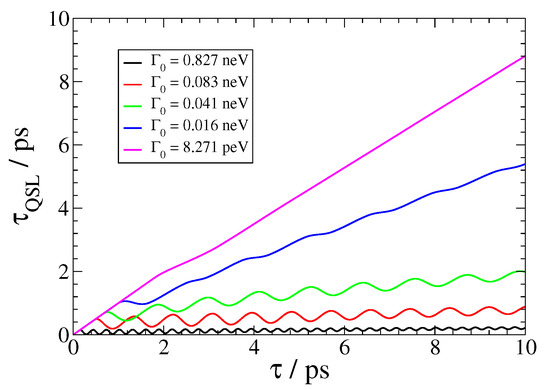 and t denoting the actual driving time of the open system. Thus, when , Equation (18) implies that the QSL is equal to the actual driving time; otherwise, QSL always has a smaller value that the actual driving time, implying that by exploitation of the non-Markovianity of an open system, its actual dynamics can be accelerated in comparison to the corresponding dynamics of the system, which behave Markovian. This result is clear in Figure 4, since as the vacuum decay width becomes smaller, leading to Markovian dynamics, the corresponding curve comes closer to the (conceivable) diagonal in the plot. On the other hand, as the dynamics become strongly non-Markovian, the corresponding curve in Figure 4 comes closer to the horizontal axis; moreover, it becomes oscillatory, with increasing frequency and decreasing amplitude as the light–matter coupling strength between the QEMI and the TOPIN nanosphere becomes larger, since the vacuum decay width value increases. Independently from the coupling strength, the dynamics of the SPEM have an initial Markovian phase, as indicated by the overlap for some initial time with the (conceivable) diagonal of the plot.