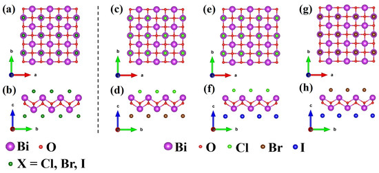 The top view and side view of BiOX monolayer (a,b) BiOX (X = Cl, Br, I), (c,d) BiOCl0.5Br0.5, (e,f) BiOCl0.5I0.5, (g,h) BiOBr0.5I0.5.