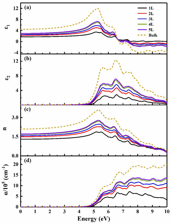 The thickness-dependent optical properties of BiOX (X = Cl, Br, I) was also investigated. At the same layer number, the calculated static dielectric constant ε(0) and static refractive index n(0) became larger with the increase in atomic number of halogen X (Table S3), as is normally expected. Figure 4 takes the optical properties of BiOCl as an example to show that the thickness dependence is similar to those of multi-layer Bi2O2X (X = S, Se, Te) [21] and MoS2 [53]. As the layer thickness increased from monolayer to bulk, ε(0), n(0), and the optical absorption coefficient became larger, the peaks of the imaginary part of the dielectric function and the optical absorption spectrum shifted to the low-energy region (redshift).