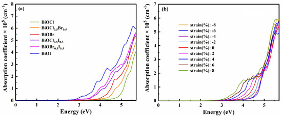 Next, we tried studying the optical properties of BiOX (X = Cl, Br, I, Cl0.5Br0.5, Cl0.5I0.5, Br0.5I0.5), in light of their importance to optoelectronic materials [18,55]. For unstrained BiOX, the static dielectric constant ε(0) and the static refractive index n(0) decreased in the order of BiOI, BiOBr0.5I0.5, BiOCl0.5I0.5, BiOBr, BiOCl0.5Br0.5, and BiOCl. This order follows the decreasing average atomic number of halogen X, so it naturally brings about the blueshifting absorption spectrum as shown in Figure 7a. This shift suggests that the absorption spectrum can be tuned on demand in the range from visible to ultraviolet. Specifically, BiOI, BiOBr0.5I0.5 and BiOCl0.5I0.5 maintain an absorption coefficient of as high as 104–105 cm−1 within the energy range of ~3.1–4.1 eV. These materials may thus be used to compensate the absorption drawback of silicon solar cells in this range to improve the utilization rate of solar energy. Hence, halogen composition tuning enhances the application potential of BiOX in the visible to violet region. With applied strains, the ε(0) and n(0) change slightly, suggesting a certain stability as the material is tuned by strain. As represented by BiOBr, Figure 7b shows the absorption spectra under strains. It is observed that the optical absorption edges and the absorption peaks redshift under tensile strain, which can improve the ability to absorb visible light. As the compressive strain increases from 0% to −6%, the optical absorption edges blueshift. Together with the fact that the absorption coefficients of strained BiOX in the ultraviolet region are not degraded by compressive or tensile strain, the above properties imply that BiOX has application potential in flexible optoelectronic devices [57].