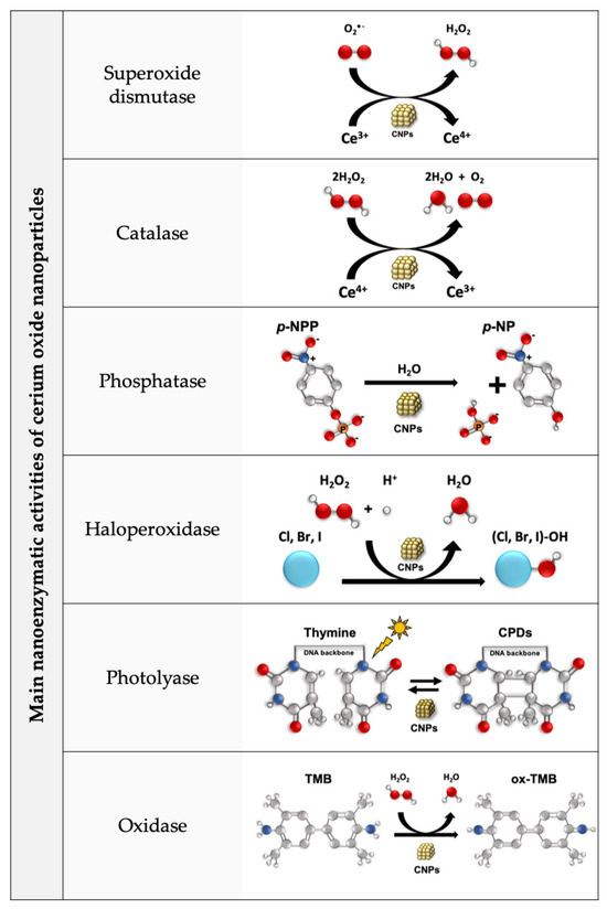 The multiple CNP enzymatic-like activities. Superoxide dismutase-like activity: CNPs reduce superoxide to hydrogen peroxide, oxidizing Ce3+ to Ce4. Catalase-like activity: CNPs oxidize hydrogen and molecular oxygen, reducing Ce4+ to Ce3+. The coupling of these two functions constitutes CNPs’ auto-regenerative redox cycle. Phosphatase-like activity: CNPs dephosphorylate para-nitrophenyl phosphate (p-NPP) in aqueous environments independently of the Ce3+/4+ redox switch and possibly due to oxygen vacancies [113]. Haloperoxidase-like activity: CNPs mediate the oxidation of halides (B, Cl, and I) by H2O2 into hypohalous acid (HOX) species. Photolyase-like activity: CNPs enable selective cleavage of dimers (e.g., cyclobutane pyrimidine dimers (CPDs)) into monomers. Oxidase-like activity: CNPs oxidase the colorimetric substrate 3,3′,5,5′-tetramethylbenzidine (TMB) to its oxidized form ox-TMB.