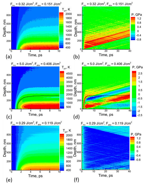 It has been experimentally established that the thermal expansion of irradiated Si targets is significantly lower than that for metals. This also corresponds to our theoretical calculations, where the linear coefficient of the thermal expansion of Si, given by the Stillinger–Weber potential, was found to be 2.6 × 10−6 1/K, which is an order of magnitude smaller than its value for Al, for instance (~25.5 × 10−6 1/K) [54]. As a result, during the process of electron–phonon interaction and laser-deposited energy transfer from the hot electrons to the lattice, even under conditions of extremely rapid heating, there is no significant accumulation of internal stresses in the pre-surface layer of the irradiated target upon reaching electron–phonon equilibrium. The highest value for the internal stresses of ~2 GPa is an order of magnitude less than that of metal targets (~20 GPa) under similar irradiation conditions. This fact is reflected in Figure 2d, as a moderate acoustic relaxation of the target. But, it was namely the relaxation of the laser-induced pressure process, which was identified for metals as the main driving process of ablation via the spallation mechanism [72].