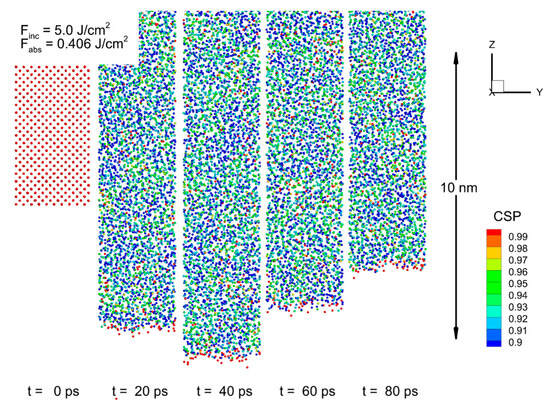 The laser ablation of the Si targets was conducted for the selected fluencies of 1, 3, 5, 7, and 10 J/cm2 at the same pulse duration of 270 fs. The sequence of atomic configurations for the case of 5 J/cm2 are shown in Figure 4. Although the silicon surface is completely melted, it can be seen that, apart from a moderate evaporation (red particles), there is no removal of material by the spallation mechanism (in large chunks and droplets, or entire layers) [74]. The reasons for such a weak response by the target to a rather large energy input of short duration (a much shorter pulse length than the characteristic electron–phonon equilibration time of τe-ph ~2–5 ps) can be understood by considering the contour plots evolutions of the lattice temperature and pressure inside the irradiated target, as shown in Figure 2c,d.