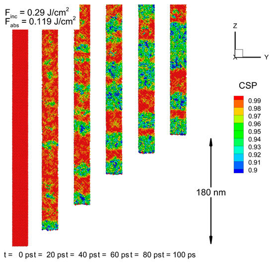 Atomic configurations of porose (33%) Si target are shown up to a depth of 300 nm for selected times of 0, 20, 40, 60, 80, and 100 ps after 270 fs laser pulse irradiation at a wavelength of 800 nm, with an incident fluence of 0.29 J/cm2. The color of atoms corresponds to CSP for determination of the local atomic order, with empirically chosen criterion between the solid (CSP > 0.97) and the liquid (CSP < 0.97) phases of the material. The laser pulse is directed from the bottom.