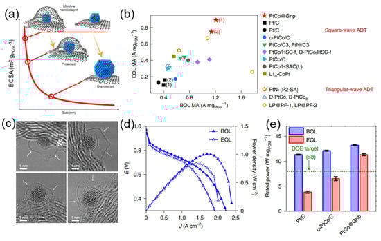 (a) Schematic illustration of ultrafine nanocatalysts encaged in graphene pockets and their impact on ECSA retention after an ADT. (b) Comparison of mass activity between PtCo catalysts with the state of the art in the literature. (c) The enclosure of ultrafine nanoparticle by graphene nanopockets (indicated by white arrows). (d) Comparison of PtCo@Gnp at BOL and EOL. (e) Rated power of MEAs normalized by the total PGM loading [].