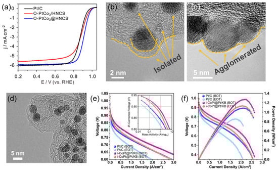 (a) LSV curves in O2-saturated 0.1 M HClO4 solution at room temperature, with a scan rate ~10 mV/s. (b,c) TEM images at different magnifications of O-PtCo3@HNCS and O-PtCo3/HNCS []. (d) TEM image of i-CoPt@Pt/KB, (e) H2-O2 fuel cell polarization curves, and the derived Tafel plots (inset) before and after ADT cycling. (f) H2-air fuel cell polarization and power density curves of i-CoPt@Pt/KB and Pt/C before and after ADT cycling [].