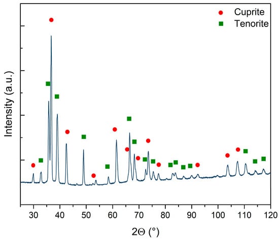The crystal structure of the CuxO NW sample matrix was investigated through XRD to determine the distinct phases of the sample and/or the presence of amorphous components. The diffractogram (see Figure 2) demonstrated the presence of two distinct oxide reflections on the copper foil surface after the thermal treatments: a bottom layer consisting of cuprite (COD 9007497) and a top layer consisting of tenorite with at least two different crystalline sizes (COD 9016105 and 9014580). The main parameters retrieved by the Rietveld refinement for the three crystal structures are reported in Supplementary Table S1. It is worth noticing that the cuprite and one of the tenorite phases had quite similar sizes, while the second phase of tenorite had a far larger crystal of 2530 Å on average. Cuprite represented 44% of the sample, while the remaining 56% was tenorite. Interestingly, when the two phases of tenorite were computed, metallic copper disappeared from the refinement. When copper foil is exposed to high temperatures in ambient atmosphere, the surface undergoes oxidation. This process first leads to the formation of a Cu2O layer, followed by the subsequent development of a layer consisting of CuO on the top of Cu2O [44]. The growth of CuO NWs relies on copper diffusion from the substrate foil through both the oxide layers via stress induced at the interface of these layers [45,46,47,48]. This mechanism is confirmed by the presence of both CuxO phases, cuprite and tenorite, which are a direct consequence of the Cu foil’s thermal oxidation: on the copper surface, there are two oxide layers, the bottom composed by Cu2O and the top composed by CuO [28,44,49,50].