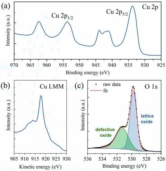 XPS HR spectra of (a) Cu 2p region, (b) Cu LMM region, and (c) O 1s region with peak deconvolution into lattice oxides (in blue) and defective oxides (in green).