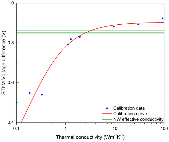 To relate the effective thermal conductivity to thermal conductivity of the NW itself, a simple Finite Difference method (FDM) model was used [74]. The model assumed that the heat transfer was diffusive, which might be correct for the amorphous NW; however, it might have large errors for both air heat transfer, small probe–sample separations, and crystalline materials. The FDM model provides heat power flowing through the probe–sample system, which is not the same signal as SThM voltage difference. The SThM voltage difference relies on many factors due to the measurement setup and environmental conditions; therefore, converting it to heat power is not a simple task. To relate the numerical model to the experimental data, the sample modeling developed by Glasgow University was used [42]. As the effective thermal conductivities of the thin-film sample were known, this allowed us to set up a relation between the effective thermal conductivity, measured using SThM, and the heat power in the FDM model. Simulations were carried out with different conditions, to evaluate a simple estimation of the uncertainty of the numerical model, and a better numerical model is needed to prevent potential model-related biases. The estimated thermal conductivity of the NW under these assumptions is (3.1 ± 1.2) W∙m−1∙K−1. As mentioned before, the whole measurement and data interpretation procedure was performed twice, with two different SThM probes and on the same nanowires. The spatial resolution of the measurements and numerical model for the second case was lower, and the data were more scattered; nevertheless, the results were in agreement within the estimated uncertainty.