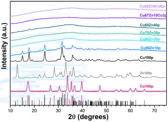 The XRD measurements carried out on the precursors and reported in Figure 1 showed two types of patterns, i.e., crystalline phases, for single-cation precursors and for the double-cation Cu90Zn10, whereas all other samples were widely amorphous. In addition, three different crystalline phases are evidenced for the single-cation precursors. Their identification was carried out by inquiry of the JCPDS database and comparison to reference compounds. The phases malachite [], hydrozincite [] and cobalt hydroxycarbonate [,] were found for the samples Cu100p, Zn100p and Co100p, respectively, i.e., in all cases, hydroxycarbonate compounds.