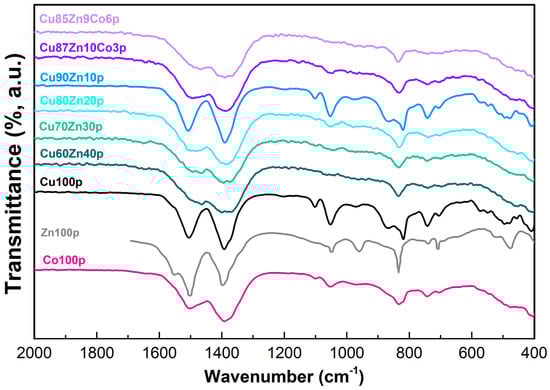 Numerous scientific papers are centered on the influence of precipitation conditions of Cu/Zn/Co nitrates with NaHCO3, which generally results in formation of different precursor hydroxycarbonates, focusing on the importance of temperature, concentration, duration of digestion and precipitation at constant, decreasing or increasing pH [,]. Most precipitation products are related to natural minerals such as malachite (Cu2(CO3)(OH)2), rosasite ((Cu,Zn)(CO3)(OH)2, where copper content is 33–50% and Zn content is 38%), zincian malachite (rosasite with low Zn content) or even the rare georgeite (Cu5(CO3)3(OH)4·6H2O) [,,,]. Quite often, the formation of synthetic rosasite with Zn contents higher than 10% leads to formation of aurichalcite (Zn5(OH)6(CO3)2) as a by-product []. Differences in their typical IR vibrations makes it possible to distinguish between the various classes of hydroxycarbonate precursors, even in the case of amorphous samples, where distinction by XRD powder diffraction is not possible.