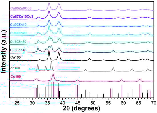 The XRD patterns of the oxides are reported in Figure 3, along with the reflexes of reference single oxide compounds, i.e., CuO with tenorite crystalline structure, monoclinic prismatic space group 2/m [,]; ZnO with zincite structure, hexagonal [], space group P63mc and Co3O4 with spinel structure, space group Fd-3m []. The samples Cu100, Zn100 and Co100 display a one-to-one correspondence with the reflexes of the reference compounds tenorite, zincite and spinel, respectively. The double- and triple-cation oxides were analyzed by Rietveld refinement to determine both the number of phases present, as well as the lattice parameters upon formation of solid solutions. The Cu90Zn10 is characterized by a single phase, i.e., tenorite, though with a variation in the lattice parameters and an increase in cell volume as compared to Cu100, compatible with 10% substitution of Zn in the CuO lattice []. Further increase in Zn content results in the segregation of a zincite phase, in percentages corresponding to 10.2%, 19.7% and 30.6% for the samples Cu80Zn20, Cu70Zn30 and Cu60Zn40, respectively. As for the lattice parameters, there is no significant variation in zincite in the binary cation oxides as compared to Zn100. Cu80Zn20, Cu70Zn30 and Cu60Zn40 have similar lattice parameters as Cu90Zn10, thus indicating that there is an upper solubility limit of Zn in tenorite corresponding to 10%, according to the current synthetic method. Beyond this level, zincite forms. However, although Cu2+ ions are present, they are hardly included into the zincite lattice, as indicated by the lattice parameters, which are nearly the same as in the sample Zn100.