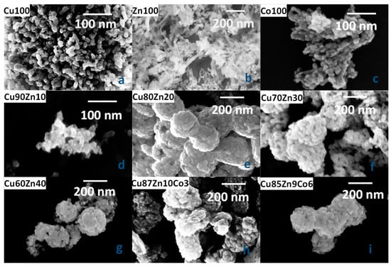 SEM images of the synthesized oxides: (a) sample Cu100, (b) sample Zn100, (c) sample Co100, (d) sample Cu90Zn10, (e) sample Cu80Zn20, (f) sample Cu70Zn30, (g) sample Cu60Zn40, (h) sample Cu87Zn10Co3, (i) sample Cu85Zn9Co6.