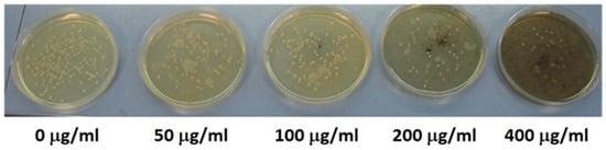 E. coli inhibition growth was assessed by CFU counting after 24 h incubation in the dark at four different oxide concentrations and compared to the control. In Figure 5, Petri dishes are reported after seeding with Cu100 (as an example) at the four selected concentrations, i.e., 50 μg/mL, 100 μg/mL, 200 μg/mL and 400 μg/mL, and 24 h incubation in the dark. The control is also reported.