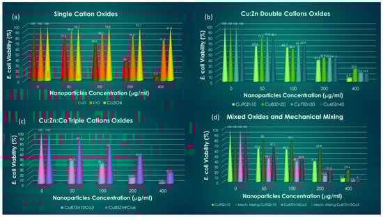 In Figure 6, the hystograms with the E. coli viability are reported in four different panels: (a) for single-cation oxides, (b) for double-cation oxides, (c) for triple-cation oxides and (d) for selected mixings of single oxides.