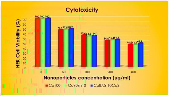 Cytotoxicity assay as a function of the doses of Cu100, Cu90Zn10 and Cu87Zn10Co3.