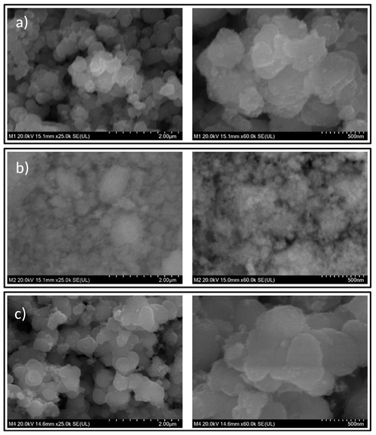Figure 1 shows SEM micrographs of the synthesized materials in 25,000× and 60,000× increases. The micrography of the NMs of TiO2 (Figure 1a) shows agglomerates of various sizes with non-geometric morphology. Similarly, Fe3O4 (Figure 1b) NMs exhibit irregular morphology with no size homogeneity, although smaller than the TiO2 NMs. On the other hand, the NMs composite (Figure 1c) shows morphological characteristics similar to those of TiO2 NMs.
