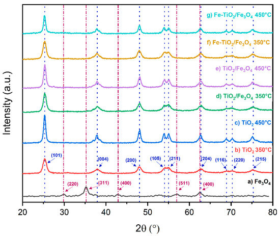 Figure 4 shows the X-ray diffraction patterns of the synthesized materials. The diffraction pattern of TiO2/Fe3O4 indicates a certain degree of crystallinity, showing five characteristic Bragg reflections of the magnetite phase at angles 30.44°, 35.79°, 43.42°, 57.46°, and 63.0° (JCPDS 19-0629) [41]. The TiO2 material calcined at both temperatures shows nine Bragg reflections associated with the anatase phase at angles 25.1°, 37.7°, 47.8°, 53.6°, 54.8°, 62.5°, 68.7°, 70.1°, and 75.1° (JCPDS 21-1272) [42,43]. The diffraction patterns of the composites reveal the presence of the nine signals attributed to anatase without any reflections belonging to the magnetite phase due to its low percentage of TiO2.