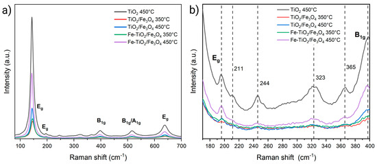 Figure 5a presents the Raman spectrum of the TiO2 samples treated at 450 °C and the undoped and doped NMs treated at 350 °C and 450 °C. All materials exhibit five signals associated with anatase located at 144, 195, 638 cm−1 (Eg) and 398 and 518 cm−1 (B1g/A1g) [46]. Besides the anatase vibrational modes, four additional signals are observed in the 180–400 cm−1 range, which is attributed to the brookite phase (Figure 5b) [46].