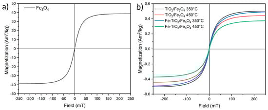 A magnetic susceptibility test was performed on Fe3O4 and composite NMs to determine their magnetic behavior through hysteresis. Figure 6a indicates that Fe3O4 NMs have a saturation magnetization of approximately 40 Am2kg−1. The hysteresis curve shows a superparamagnetic behavior with a small ferromagnetic contribution due to particles exceeding the superparamagnetic domain boundary [38]. Figure 6b displays the hysteresis curves of the NM composites possessing a saturation magnetization range of 0.3 to 0.5 Am2 kg−1 due to a low proportion of magnetic material concerning TiO2. Despite the decrease in magnetization after calcination, composites treated at 350 °C and 450 °C possess a response to a magnetic field having a superparamagnetic behavior with a small ferromagnetic contribution.