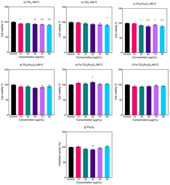 MTS cell viability test graphs for each NM are shown in Figure 9; based on the results, it can be observed that TiO2 350 °C (Figure 9a) causes a cell viability decrease (5.4–9.8%) with statistical significance at 10, 50, 70, and 90 µg/mL. Contrary, TiO2 450 °C (Figure 9b) only shows differences in cell viability at 90 µg/mL with a reduction of 9.4%. The composite materials of TiO2/Fe3O4 at 350 °C (Figure 9c) caused a reduction at 30, 50, 70, and 90 µg/mL of 5.2–11%, the reduction being the highest at 50 µg/mL. The composite calcined at 450 °C (Figure 9d) shows no difference in cell viability compared to the control. The iron-doped composites (Figure 9e,f) show no effect of decreased or increased cell viability, suggesting that they do not affect cell viability at the concentrations used compared to undoped composites. Finally, the results obtained with the magnetite NMs (Figure 9g) show no trend in effect on cell viability with increasing concentration, where only the treatment at 30 µg mL−1 caused a reduction of 7.8%. Along the tested NMs, no apparent effect of cell viability concerning the concertation of NMs was determined. However, it is possible to observe that the main statistical differences are obtained in NMs thermally treated at 350 °C with a slight reduction of cell viability as the concentration increases. On the other hand, NMs thermally treated at 450 °C, including Fe3O4, show a lateral variation of cell viability.
