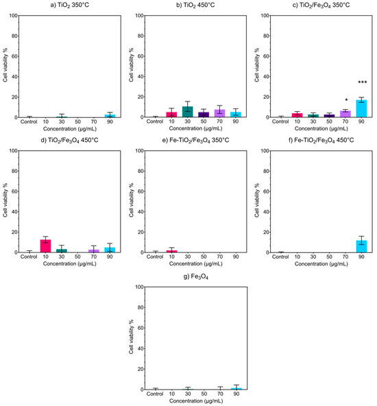 LDH cell viability assays of (a) TiO2 at 350 °C, (b) TiO2 at 450 °C, (c) TiO2/Fe3O4 at 350 °C, (d) TiO2/Fe3O4 at 450 °C, (e) Fe-TiO2/Fe3O4 at 350 °C, (f) Fe-TiO2/Fe3O4 at 450 °C, and (g) Fe3O4. Cell viability by LDH assay was determined after 24 h of exposure to increasing concentrations of NPs. Each bar represents the average value of 3 different experiments ± SEM; * p < 0.05, *** p < 0.001 vs. untreated cells. ANOVA, Bonferroni post hoc.