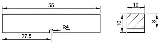 The impact toughness test is conducted using the JBW-300 testing machine (Nanjing, China). The sample is made with a U-notch (as shown in Figure 1), and the surface is polished and ultrasonically cleaned for 15 min to achieve a roughness (Ra) of ≤5.0 μm. The standard sample is then placed on the testing machine, and the impact test is carried out with a pendulum with a measuring range of 150 J.