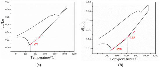 Relationship between volume variation and different cooling rates of the steel: (a) 0.1 °C/s, (b) 0.05 °C/s.