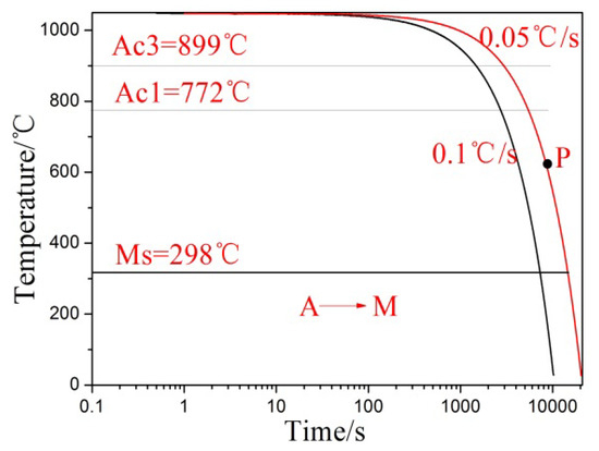 Figure 3 illustrates the relationship between volume variation and different cooling rates for the steel. At a cooling rate of 0.1 °C/s, the phase transformation process shows only one martensite transformation occurring at 298 °C. However, when the cooling rate is reduced to 0.05 °C/s, two phase transitions are observed. The first transition is the pearlite transformation, which takes place at 625 °C. The second transition is the martensitic transformation, occurring at 298 °C.