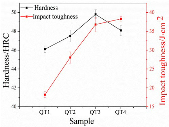 This study conducted hardness and impact toughness tests on QT1–QT4 samples at various quenching temperatures. As shown in Figure 9, the macro hardness of all samples is consistently above 45 HRC across the different quenching temperatures (950–1100 °C). Initially, as the quenching temperature increases, the hardness also increases, reaching a peak value of 49.8 HRC at 1050 °C. However, at 1100 °C, the hardness starts to decrease. The reason behind this trend is that as the quenching temperature rises, the process of austenitization becomes more complete, and the diffusion driving force of alloying elements increases. This leads to the precipitation of alloying elements within the austenite, enhancing the hardenability of the steel and resulting in the formation of more martensitic structures. At 1050 °C, the resulting martensitic and nano residual austenite are uniform with a relatively fine grain size, which contributes to higher hardness. However, as the quenching temperature further increases, the austenite grains grow larger, causing the final martensitic structure to become coarser. According to the empirical formulas [24], it is known that the size of grain and lath decreases with decreasing austenite grain size.
