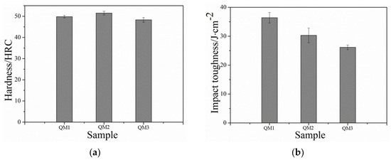 Figure 12a illustrates the hardness results of the QM1, QM2, and QM3 samples after being quenched with different media. The data indicates that the differences in hardness among the steels quenched with different media at the same quenching temperature are relatively small. Overall, the oil-quenched sample (QM2) exhibits the highest hardness, followed by the water-quenched sample (QM1), while the air-quenched sample (QM3) demonstrates the lowest hardness. This trend can be explained by considering the cooling rates of the quenching media. Although the critical cooling rate for martensite formation in the steel is relatively low, all three media exceed this critical cooling rate. However, due to the faster cooling rate of water as a quenching medium, the transformation of austenite occurs at a faster rate, thereby increasing the probability of martensite nucleation. As a result, the size of residual austenite in the microstructure becomes smaller and more uniformly, leading to the highest hardness observed in the water-quenched sample. Conversely, the slower cooling rate of air quenching results in reduced martensite formation and a bigger residual austenite, leading to a lower hardness in the air-quenched sample.