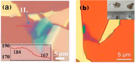 Atomic force microscopy images of 2D TMDs alloys prepared through mechanical exfoliation. (a) Optical image of exfoliated Mo0.47W0.53S2 flakes on Si/SiO2 substrate. Monolayer region is labelled as “1L”. The inset shows red colour intensity along the red dashed line, giving a contrast of (184–167)/184 = 9.2% for the 1L. Reproduced with permission [16]. Copyright 2013, American Chemical Society; (b) optical image of Mo0.67W0.33Se2 sheets. Inset in panel (b) is a photograph of Mo0.67W0.33Se2 single crystals. Reproduced with permission [17]. Copyright 2014, American Chemical Society.