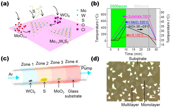 The CVD method is a widely used technique for producing thin film materials. This method involves the chemical reaction of one or more gas-phase molecules on the surface of a substrate, resulting in the formation of thin film materials. It is generally divided into three reaction processes, namely, the formation of gas-phase molecules, the transfer of gas-phase molecules to the deposition area, and a reaction to form the target thin film sample. Here, we discuss and study the preparation of alloy materials by using the CVD method using Mo1−xWxS2 as an example. In their study, Wang et al. utilised the low-pressure chemical vapour deposition technique to synthesise high-quality thin film materials of Mo1−xWxS2 [18]. Figure 3a shows the reaction schematic of the sample prepared by using the CVD method. They used three precursors and substrates placed in the reaction system in a certain order, with components, purity, and content as follows: WCl6 (99.9%, ~5 mg), sulphur (99%, 1.0 g), MoO3 (>99.5%), and substrate (slide S1214). They were placed in a quartz tube with a diameter of 2 inches in the order shown in Figure 3c. The experiment utilised high-purity argon gas as the carrier gas. Four distinct temperature zones were employed to regulate the temperature of various precursors. The argon flow rate was adjusted to control the pressure. The temperature profile plot in Figure 3b illustrates the temperature distribution. There were three main stages. The first was the first 10 min of the warming stage, where the four precursors were warmed up to the set value temperature, i.e., WCl6 was 35 °C, sulphur was 130 °C, MoO3 was 520 °C, and the substrate was 700 °C, corresponding to an argon flow rate of 2000 sccm. Then, the next 15 min was the growth stage of the target film sample; here, it should be noted that WCl6 grew gradually. During the cooling phase of the CVD reaction, WCl6 was rapidly cooled to 15 °C for the final 5 min. Subsequently, the remaining components were cooled to room temperature once the entire CVD reaction had concluded. The final samples were processed, and they were transferred using a standard methyl methacrylate (PMMA)-assisted transfer method by spin-coating with PMMA, effectively separating the samples on the glass substrate with aqueous NaOH solution, then salvaging the PMMA-coated Mo1−xWxS2 film samples through other substrates, and dissolving the PMMA using acetone. The thin film sample material was acquired as the final target (as shown in Figure 3d). The multilayer sample is represented by the bright area, while the monolayer sample is indicated by black lines in the figure. The substrate is depicted by the light brown area.