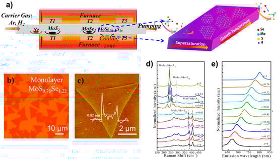 (a) Illustration of monolayer MoS2(1−x)Se2x growth. (b) Optical image, (c) AFM image, (d) the composition-dependent Raman spectra, and (e) the composition-dependent photoluminescence (PL) spectra. Reproduced with permission [20]. Copyright 2015, American Chemical Society.
