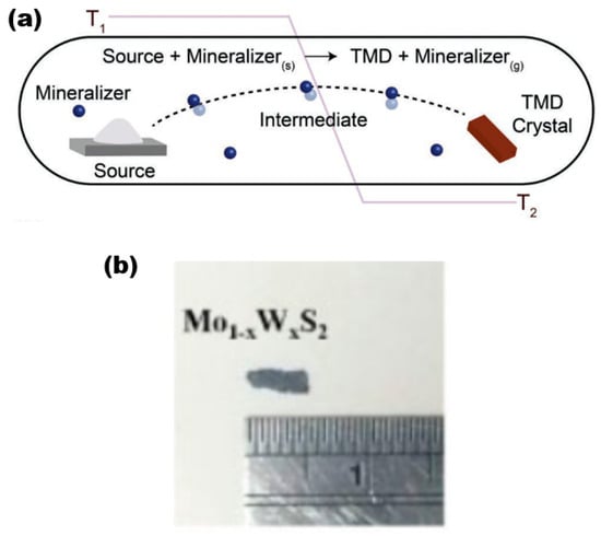 (a) Schematic diagram of the reaction process of the CVT method. Reproduced with permission [28]. Copyright 2019, Wiley-VCH. (b) Mo1−xWxS2 sample pictures. Reproduced with permission [30]. Copyright 2017, IOP Publishing on behalf of the Japan Society of Applied Physics (JSAP).