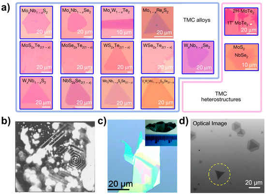 Optical microscopy plays a crucial role in the initial examination of a sample microstructure and serves as a tool for characterising the underlying morphology. By utilising OM, we can obtain fundamental information about the sample surface, such as size and morphology. Figure 8 shows 2D optical photographs of materials taken by researchers using optical microscopy [19,33,34,35]. In Figure 8a are the ternary alloy materials MoSxTe2−x, MoSexTe2−x, WSxTe2−x, WSexTe2−x, NbSxSe2−x, MoxN1−xS2, MoxNb1−xSe2, Mo1−xRexS2, WxNb1−xS2, WxNb1−xSe2, and MoxW1−xTe2, the quaternary alloy MoxNb1−xS2ySe2(1−y), the quintuple alloy material VxWyM1−x−yS2zSe2(1−z), and the optical pictures of the 1T’-MoTe2/2H-MoTe2 and MoS2-NbSe2 heterostructures. The optical photographs presented herein depict the surface morphology of the bulk crystalline material. Figure 8b displays a photograph of a single crystal of MoS2, showcasing a hexagonal spiral shape that is associated with the material growth mechanism. By examining the sample photographs captured via an optical microscope, one can obtain preliminary information regarding the sample’s shape, size, and other characteristics. In addition, from the obvious optical contrast lining for few-layer materials, such as in the optical photograph of SnSe0.5S1.5 nanosheets in Figure 8c and the photograph of a single crystal of SnSe0.5S1.5 shown in the inset, we can predict the thickness of the sample, i.e., the darker areas have a large thickness under the optical microscope, while the relatively brighter areas have a smaller thickness.