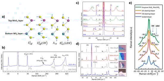 (a) Schematic diagram of lattice structure and vibrational mode for bilayer heterostructure WS2/MoS2. (b) Raman Spectra of Bulk MoWS2 and MoS2; (c) low-wavenumber Raman in Polarised Mode of bulk, 1L, and 2L alloy flake MoWS2; (d) polarisation Raman spectra of few-layer MoWS2 on different substrates; and (e) low-frequency Raman spectroscopy of layer breath mode and shear mode. (a,e) Reproduced with permission [38]. Copyright 2016, Wiley-VCH. (b–d) Reproduced with permission [48]. Copyright 2015, AIP Publishing.