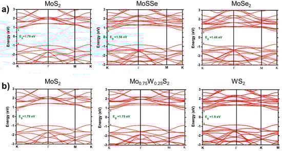 Band structures are shown for the TMD-ML alloys. (a) MoS2(1−x)Se2x with x = 0.0, 0.5, and 1.0 and (b) Mo1−xWxS2 with x = 0.0, 0.25, and 1.0. Reproduced under the terms of the CC-BY 4.0 license [55]. Copyright 2021, The Author(s). Published by IOP Publishing Ltd. on behalf of the Institute of Physics and Deutsche Physikalische Gesellschaft.