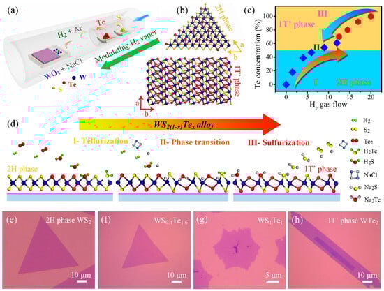 (a) Schematic illustration of the WS2(1−x)Te2x CVD system. (b) Crystal structures of 2H and 1T′ phase WS2(1−x)Te2x alloys, showing the distinguishing atomic configurations. (c) Summary of the Te concentration and the phase evolution as a function of the amount of H2 gas flow. (d) Growth schematic for preparing 2H and 1T′ phase WS2(1−x)Te2x alloys in our work. Part I and III: the evolutions of the telluriding (or sulphuring) process by increasing (or decreasing) the H2 environment. Part II: the phase conversion from 2H to 1T′ phase with the increase in H2 gas. (e–h) OM images of 2H phase WS2, WS0.4Te1.6, 1T′ phase WS1Te1 and WTe2 domains, respectively. Reproduced with permission [60]. Copyright 2019, Elsevier.