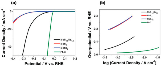 (a) IR-corrected linear sweep voltammograms of MoS2(1−x)Se2x; (b) Tafel plots corresponding to MoS2(1−x)Se2x and Pt–C. Reproduced with permission [15]. Copyright 2014, Royal Society of Chemistry.