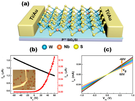 Alloyed 2D TMDs materials exhibit more unique electrical properties than 2D TMDs. Liu et al. [74] successfully synthesised NbxW1−xS2 alloy materials and constructed field-effect transistor devices based on the alloy materials. The electrical measurements conducted indicated that the addition of Nb atoms to WS2 resulted in the manifestation of P-type semiconductor characteristics. The incorporation of Nb dopants could effectively modulate the band gap of NbxW1−xS2 and enhance the optical properties of WS2. The carrier type of WS2 underwent a transition from intrinsic n-type to p-type upon Nb doping, which was a significant observation. Figure 16a shows the schematic diagram of the NbxW1−xS2-based FET device. The electrical transport characteristics of WS2 and NbxW1−xS2 FETs were obtained by using electron beam lithography and vapour deposition of the sample with Ti/Au (10/30 nm) contacts and measured, and the inset shows the optical image of the NbxW1−xS2 FET device. The non-linear output of monolayer WS2 was dependent on the source drain current (Ids) and the n-type gate voltage (Vg), indicating the existence of a Schottky barrier between the Ti-WS2 contacts. And the Ids showed a decreasing trend with increasing Vg after Nb doping, which indicated that NbxW1−xS2 is heavily p-type-doped. The Ids stayed at a high value and did not saturate when Vg was adjusted, indicating a better Nb doping effect. And this phenomenon can be explained by the tunnelling transport mechanism [75,76]. The rise in conductive current observed in NbxW1−xS2 can be attributed to the increase in hole concentration resulting from the doping process. This increase in hole concentration leads to a linear increase in Ids with Vds, as illustrated in Figure 16c, when Nb is used as the dopant.