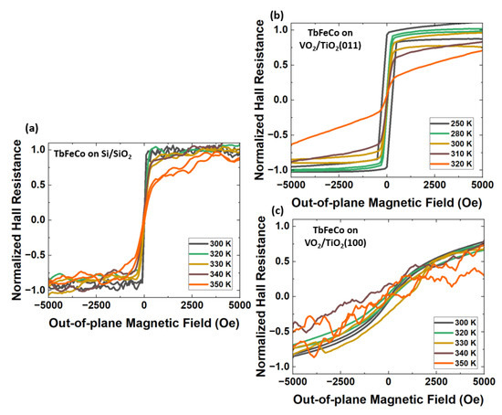 To investigate if there is any magnetic switching of TbFeCo due to MIT in VO, we fabricated each sample into Hall bar configurations and performed the anomalous Hall effect measurements on the patterned films. The anomalous Hall effect is considered here instead of direct hysteresis loops. This is because the TbFeCo films have a low magnetization of about 1 × 10 A/m, resulting in a small magnetic moment signal in the M-H loops measurements. Thus, the anomalous Hall effect is considered here for clearer results from measurements. Figure 3a–c show normalized Hall resistance as a function of the out-of-plane applied magnetic field of (a) TbFeCo/SiO/Si, (b) TbFeCo/VO/TiO(011), and (c) TbFeCo/VO/TiO(100). For higher temperatures, above 330 K, increases in noise are observed in both Figure 3a,c. We suspect this is due to the temperature effect in the patterned films. In Figure 3a, the Hall resistance of TbFeCo/SiO/Si shows very minor changes from 300 K to 350 K, which is expected. Since SiO/Si substrate has no transitions within this temperature range, the only source of strain acting on TbFeCo arises from the difference in thermal expansion between TbFeCo and SiO/Si substrate. The thermal expansion coefficient of SiO/Si substrate is 0.24 ppm/K. In comparison, the thermal expansion coefficient of amorphous TbFeCo near 300 K is about 10 ppm/K, estimated from amorphous TbFe alloy [47]. From 300 K to 350 K, due to thermal expansion is ∼500 ppm, which is 5 × 10. Using Equation (1), this gives K of about −7.5 × 10 J/m, much smaller than K of 1 × 10 J/m in TbFeCo. As shown in Figure 3a, of 5 × 10 is too small to have any effects on magnetic anisotropy in TbFeCo, and the magnetic moments of TbFeCo remain pointing in the out-of-plane directions at zero fields. These minor changes in hysteresis loops are likely due to an increase in temperature. The lack of significant changes in TbFeCo’s out-of-plane loops shows that the magnetic anisotropy of TbFeCo is near constant around room temperature.