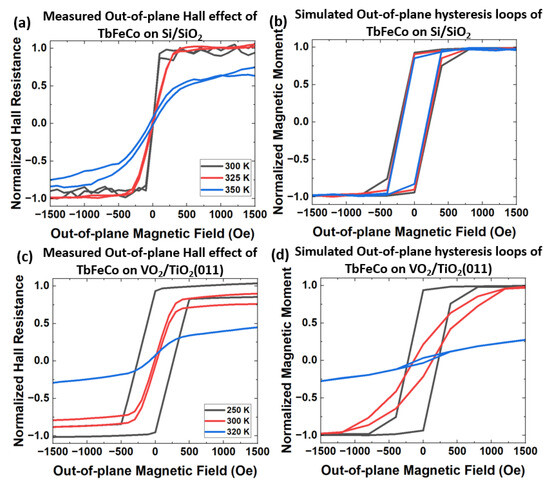Comparison of (a) measured out-of-plane anomalous Hall effect (extracted from Figure 3a) and (b) simulated out-of-plane hysteresis loops at various temperatures in TbFeCo/SiO/Si by atomistc simulations. Comparison of (c) measured out-of-plane anomalous Hall effect (extracted from Figure 3b), and (d) simulated out-of-plane hysteresis loops at various temperatures with strain anisotropy in TbFeCo/VO/TiO(011) by atomistc simulations.