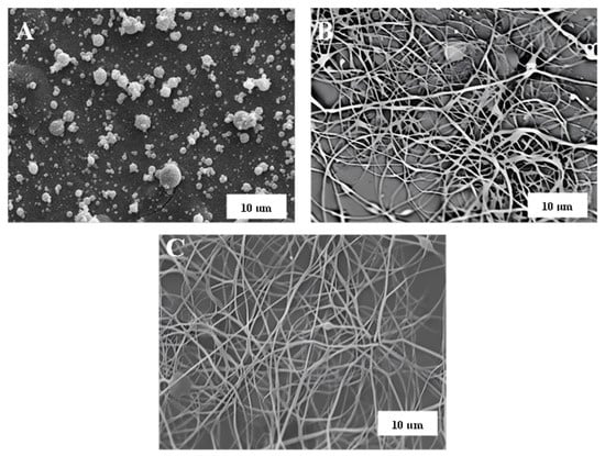 SEM Images of electrospun LSL/PVP nanostructures obtained with different LSL:PVP ratios: (A) 90:10, (B) 70:30 and (C) 50:50 (feeding solution concentration: 10% wt.).